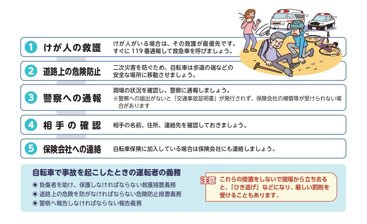 自転車の運転中に事故を起こしてしまったら、以下の流れに従い、落ち着いて行動しましょう。