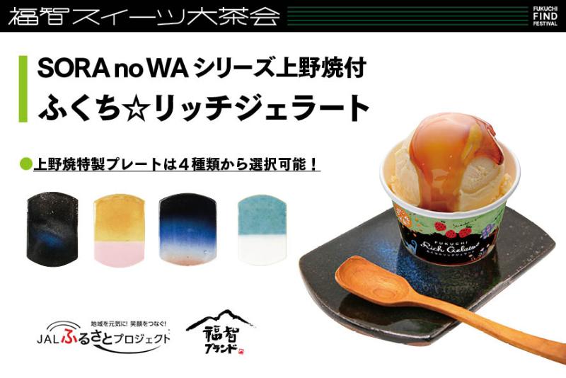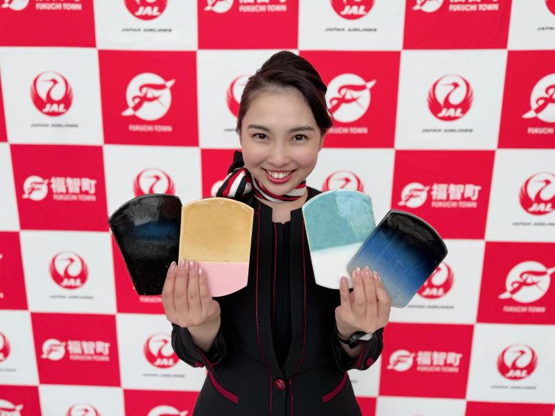 日本航空の客室乗務員である「JALふるさとアンバサダー」が「飛行機の窓からの景色」をテーマにデザインした上野焼の特製プレートと福智町の特産品「ふくち☆リッチジェラート」をセットで販売。